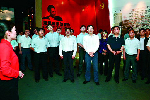 5月24日,在蘭考縣焦裕祿同志紀念館內(nèi),市委書記魏小東(前排右三)、市長范修芳(前排右四)等認真聆聽講解員的講解。